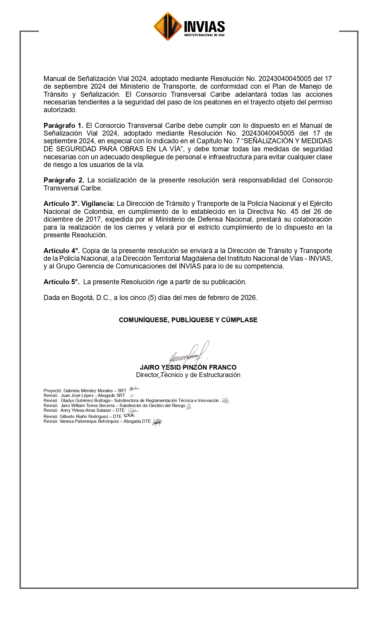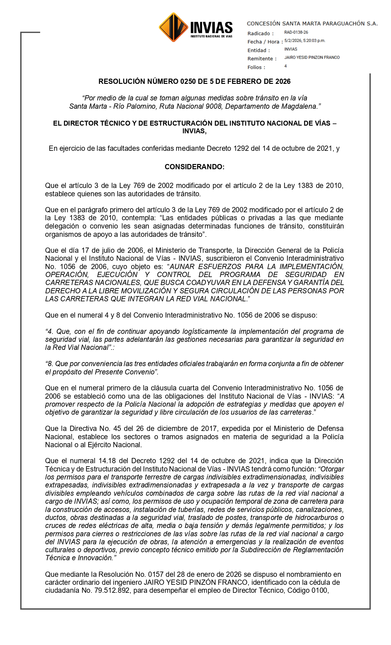«Por medio de la cual se toman algunas medidas sobre tránsito en la vía Santa Marta – Rio Palomino, Ruta nacional 9008, Departamento de Magdalena»